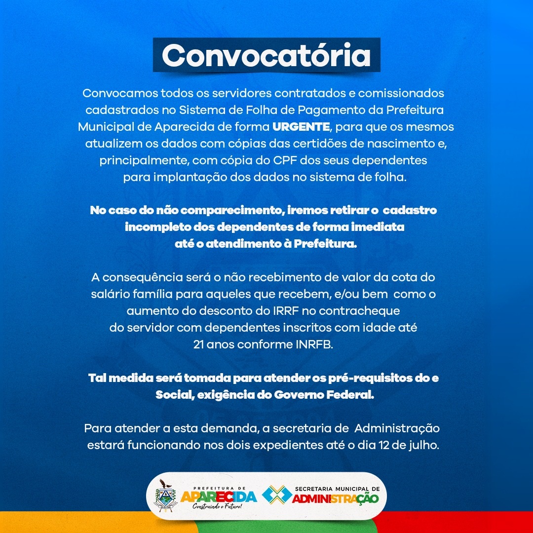 Convocamos todos os servidores contratados e comissionados cadastrados no sistema de folha de pagamento da Prefeitura Municipal de Aparecida de forma URGENTE, para que os mesmos atualizem os dados com cópias das certidões de nascimento e, principalmente, com cópia do CPF dos seus dependentes para implantação dos dados no sistema de folha.